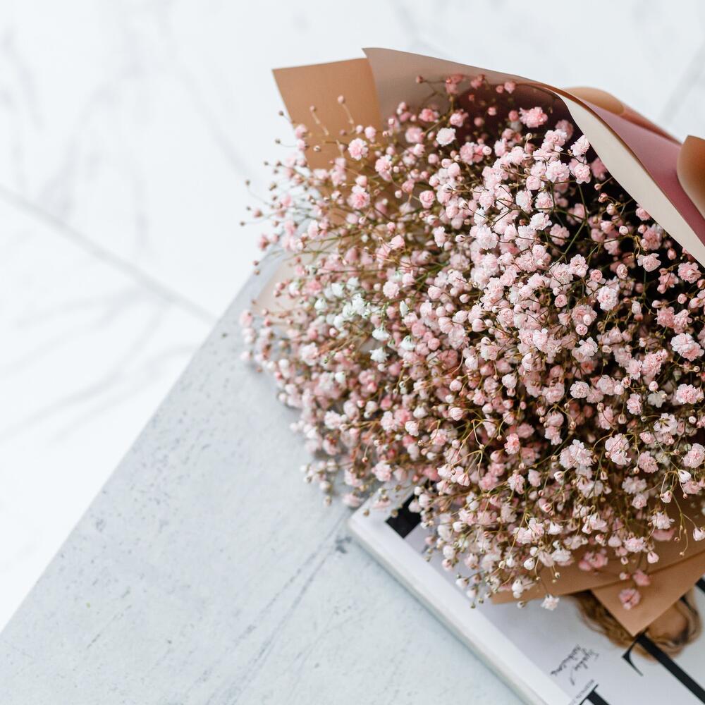 Гипсофила – 7 шт.Упаковка корейская пленка – 2 шт.Лента атласная – 1 шт.