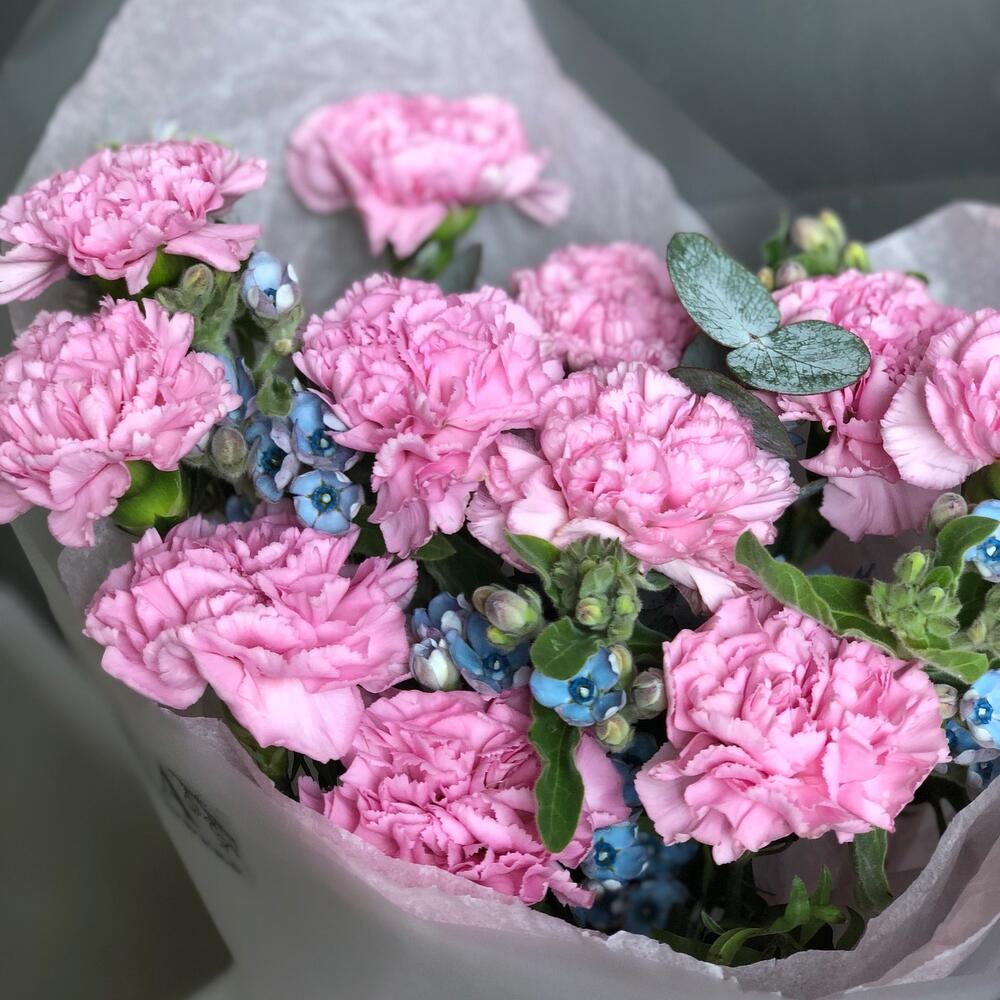 Гвоздика – 11 шт.Оксипеталум – 5 шт.Эвкалипт – 2 шт.Упаковка дизайнерская – 1 шт.