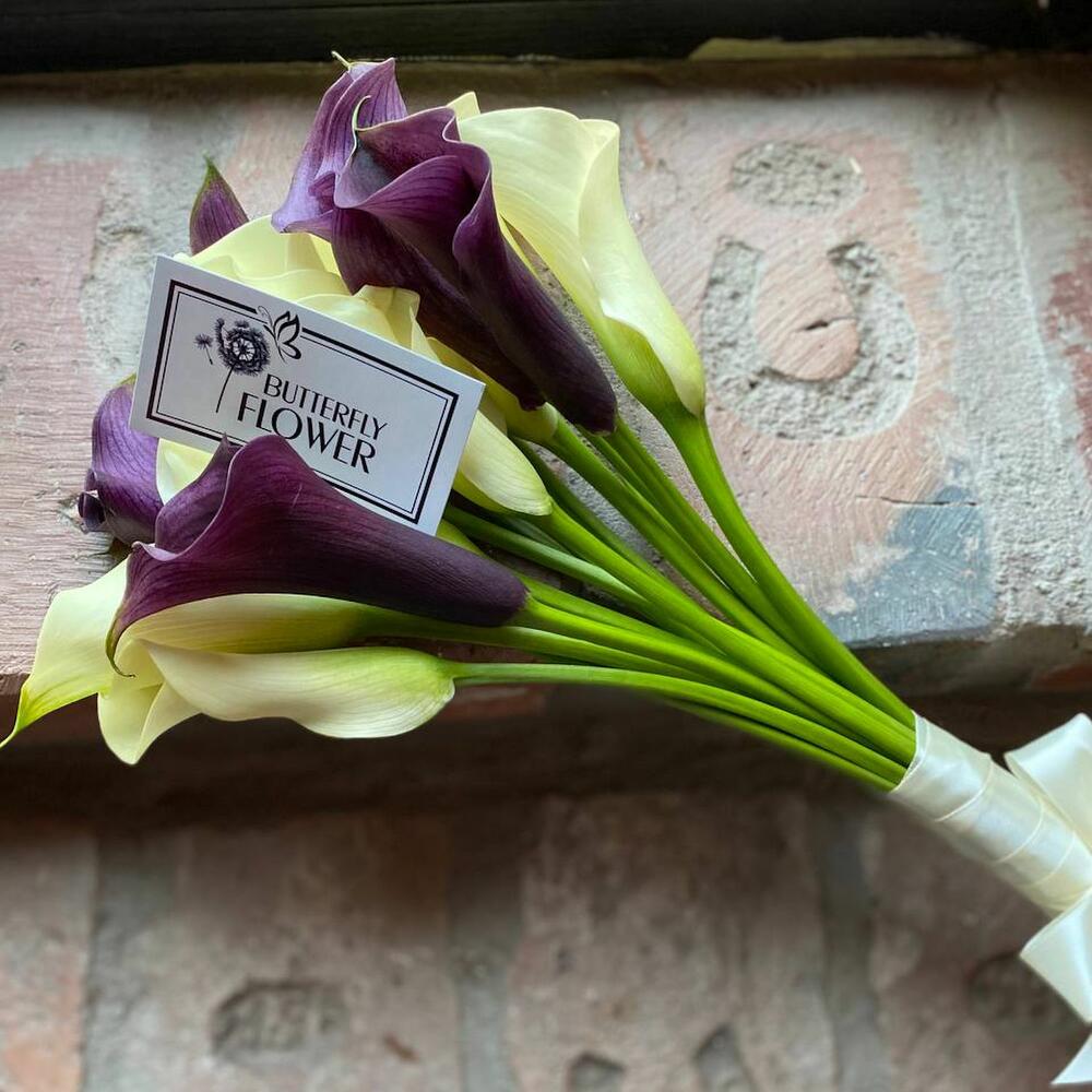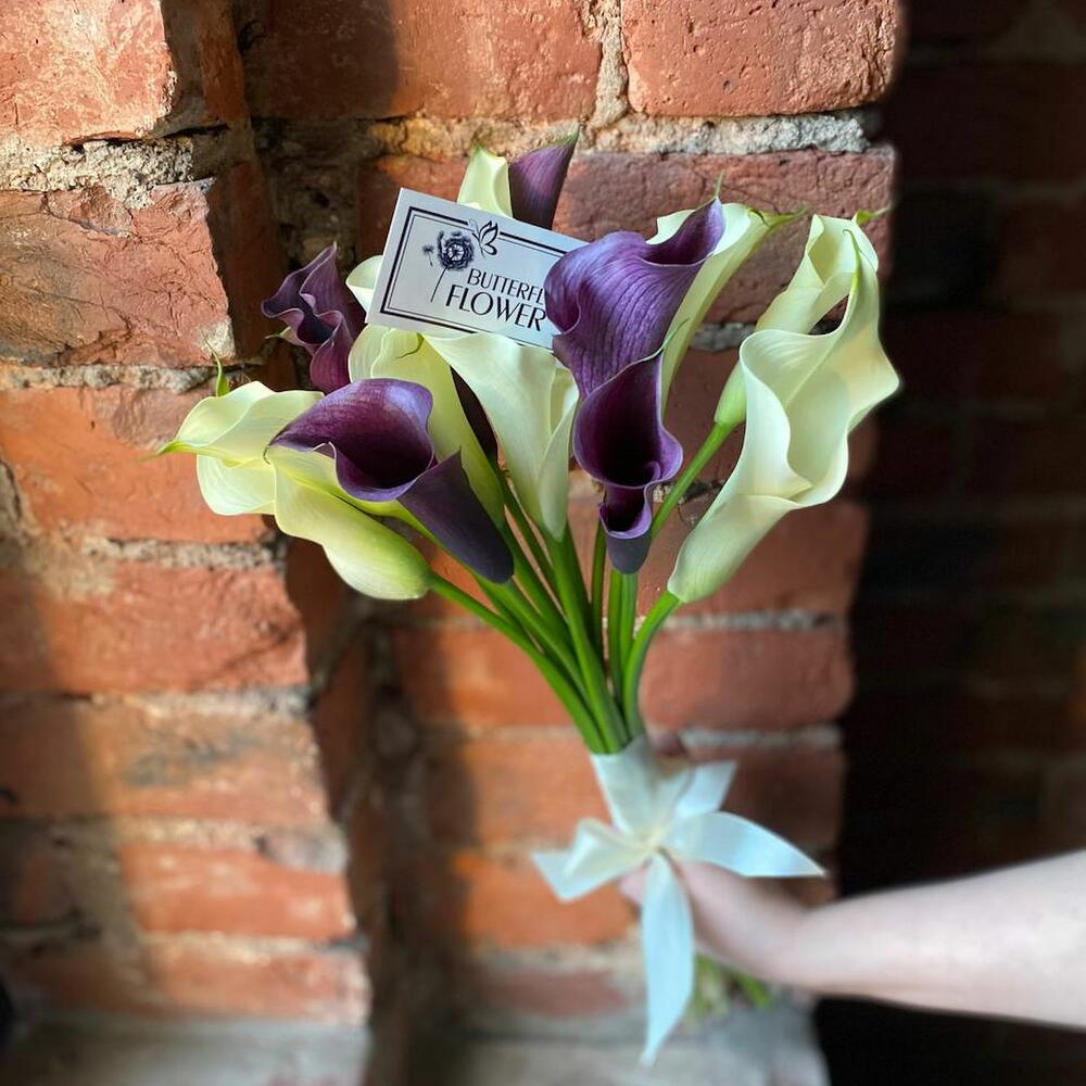 Букет из 15 черничных и белых калл “Пиксар”