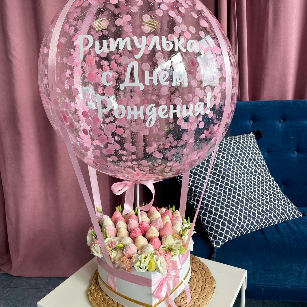 клубника в бельгийском шоколаде – 900 гр.воздушный шар с индивидуальной надписью – 1 шт.микс розовых и белых эустома – 11 шт.