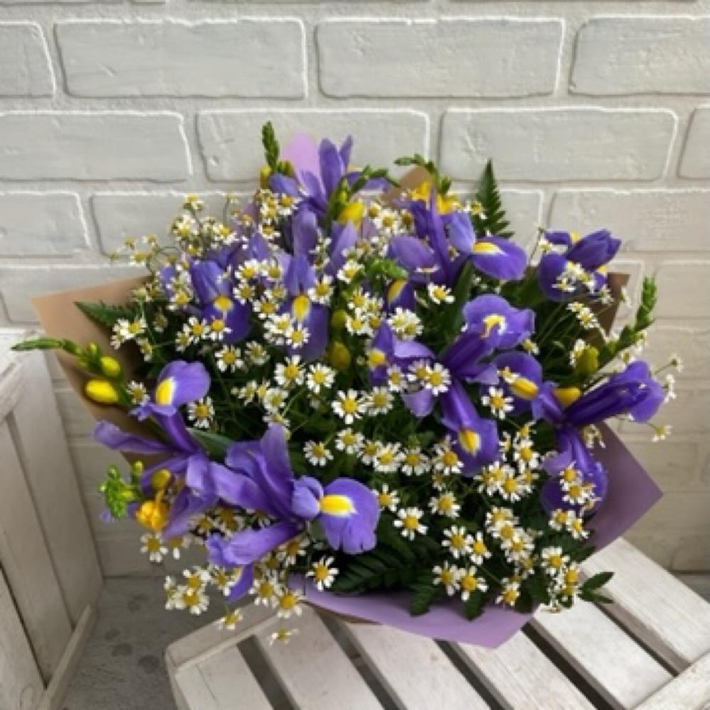 Ирисы фиолетовые – 9 шт.Фрезия желтая – 7 шт.Матрикария (Ромашка Камила) – 7 шт.