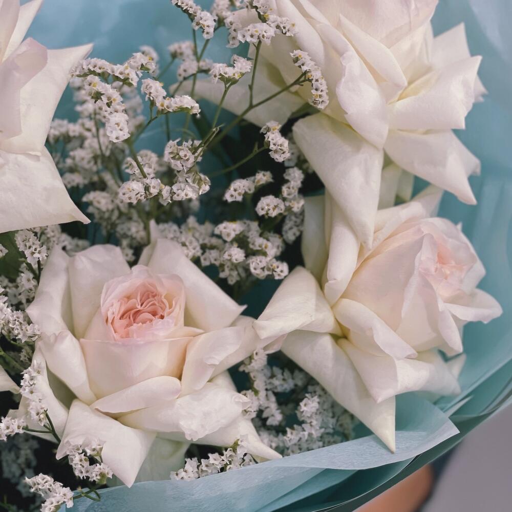 Лимониум – 4 шт.Лента атласная – 2 шт.Тишью – 2 шт.Упаковка дизайнерская – 2 шт.роза охара пионовидная – 5 шт.