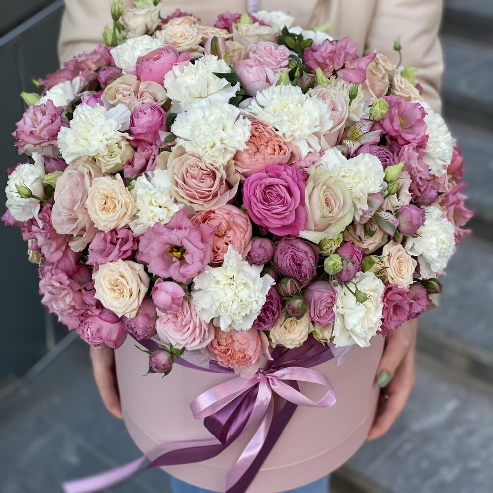 Огромная коробка с розой, эустомой, гвоздиками и альстромерией!