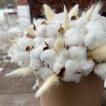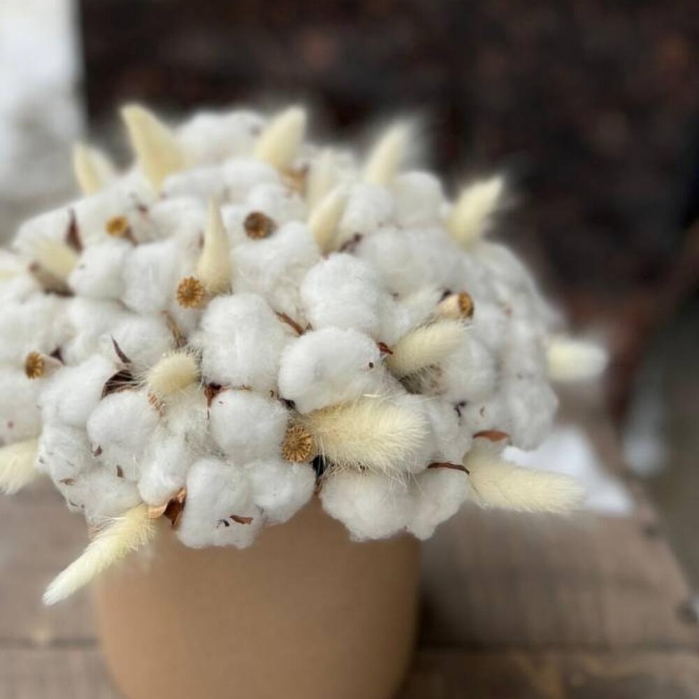 Хлопок натуральный – 25 шт.Лагурус (сухоцвет) – 15 шт.мак коробочка – 10 шт.Шляпная коробка – 1 шт.Оазис флористический – 1 шт.